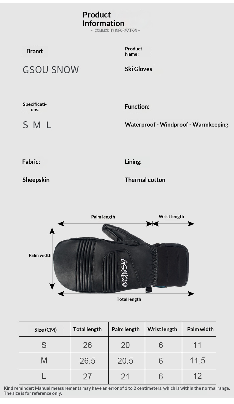 Product information: Color: White, Turmeric, Black Usage Category: Ski Gloves Size: S, M, L Material: Leather